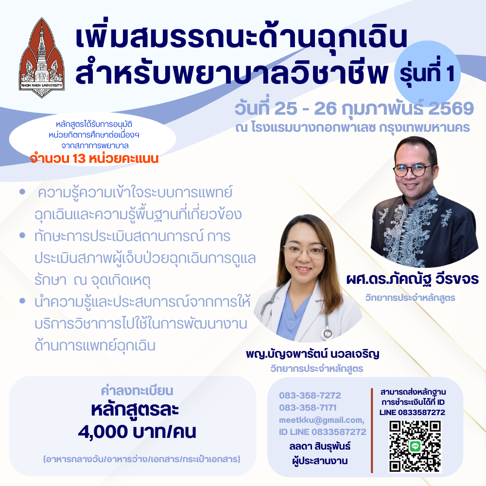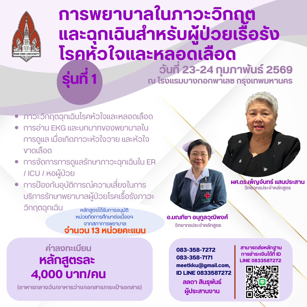 [666] หลักสูตร “การพยาบาลในภาวะวิกฤตและฉุกเฉินสำหรับผู้ป่วยเรื้อรัง โรคหัวใจและหลอดเลือด” รุ่นที่ 1 ระหว่างวันที่ 23 - 24 กุมภาพันธ์ 2569วันที่ 23 กุมภาพันธ์ 2569 - 24 กุมภาพันธ์ 2569สถานที่ โรงแรมบางกอก พาเลซ กรุงเทพฯ รายละเอียดหลักสูตร |